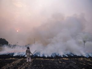 A farm worker monitors the burning of rice crop stubble in the Patiala district of Punjab, India, on Wednesday, Nov. 6, 2019. Each year India’s rice farmers burn the stubble of the harvested crop, contributing to an annual haze that damages the health of those in and around the capital. Yet the country is producing more rice than it needs thanks to government subsidies. Photographer: Prashanth Vishwanathan/Bloomberg via Getty Images